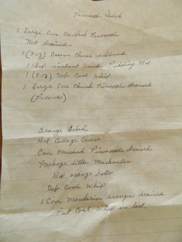 While sorting through boxes of “stuff” after our recent move, I came across an old recipe box. Inside, I discovered handwritten recipes for Pineapple Salad and Orange Salad from my Grandmother.