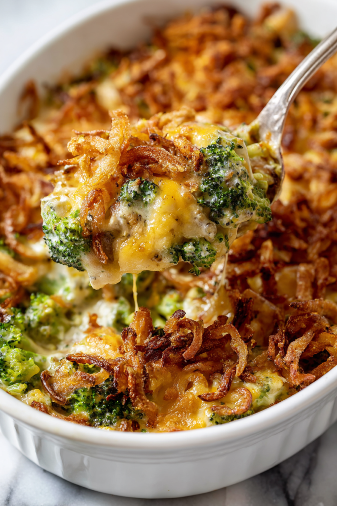 I especially love how the French fried onions add a delicious flavor to the cheesy broccoli.