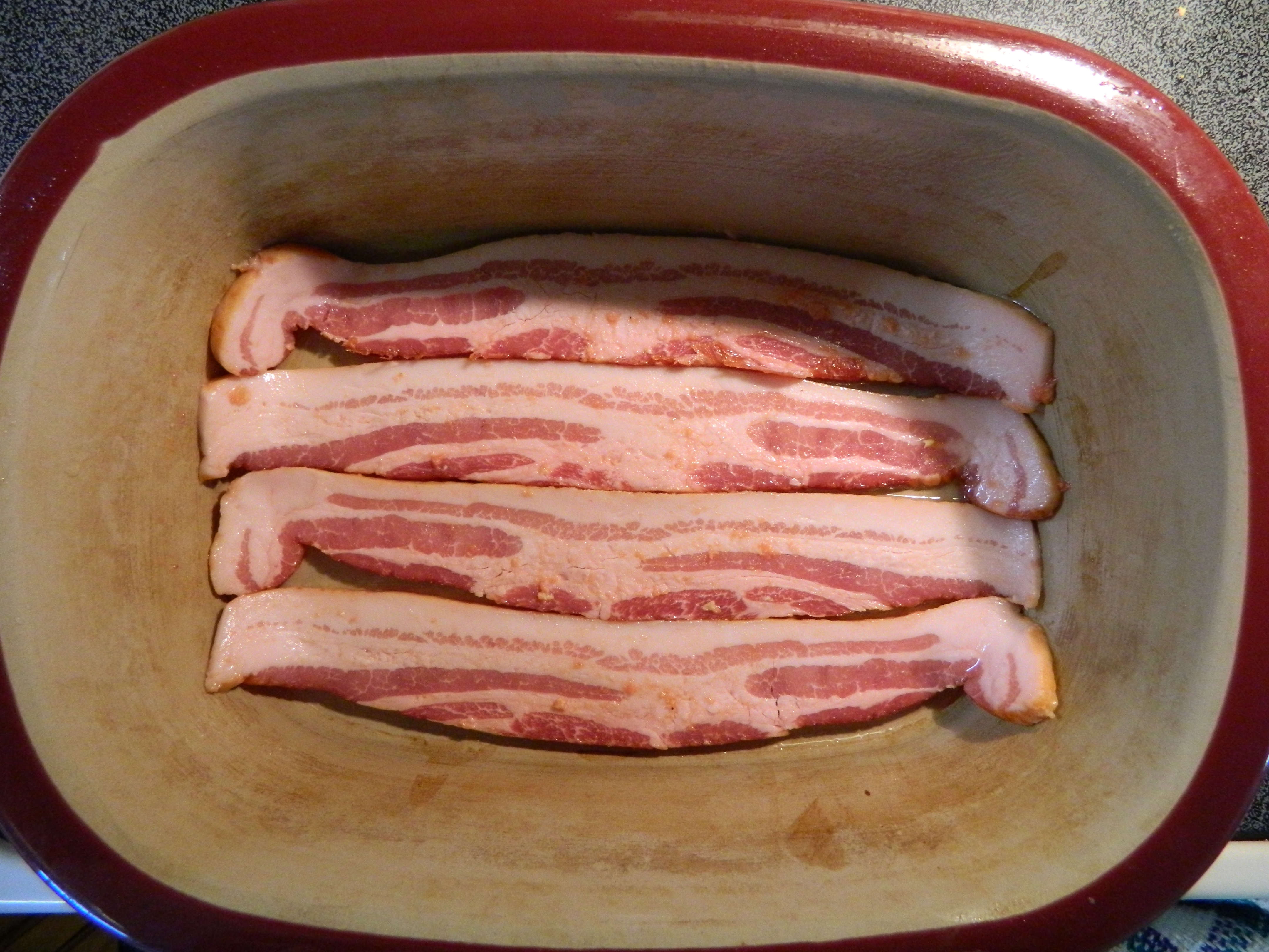 Preheat oven to 375 degrees. Layer bacon in the bottom of a 2.5 quart or 3 quart baking dish.