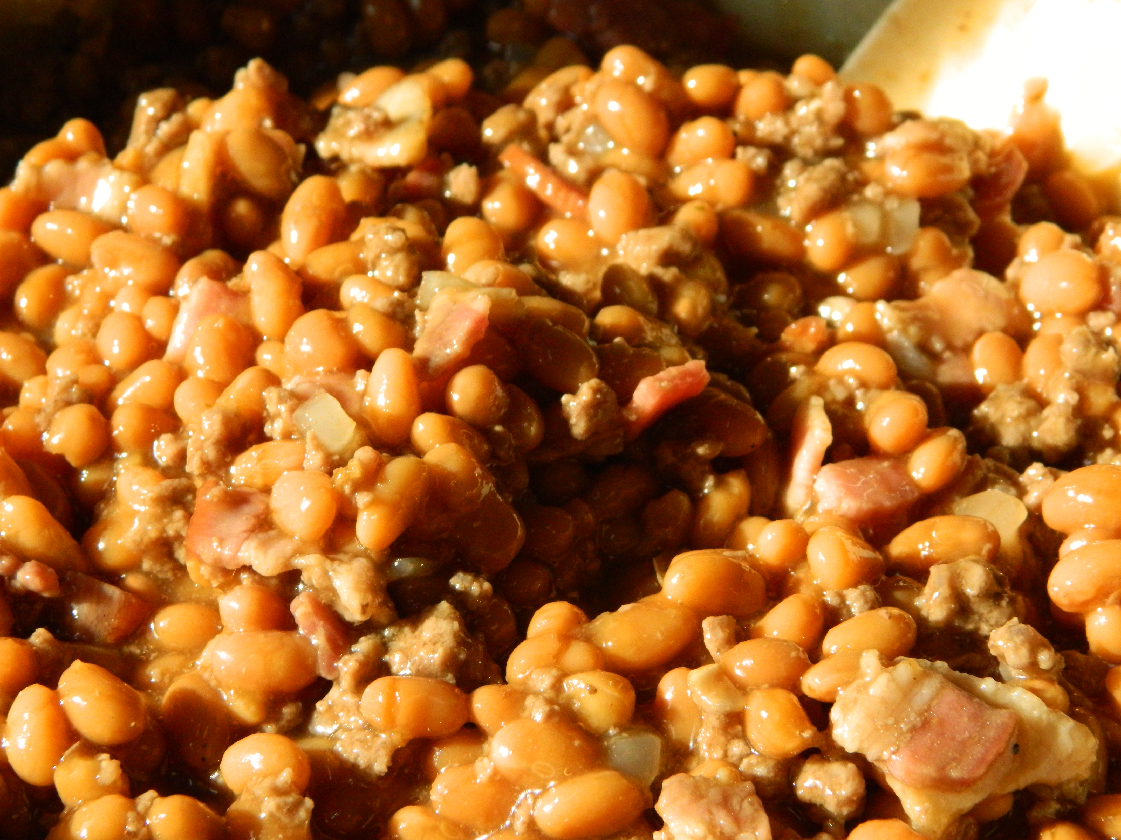 Add meat mixture to beans and stir until well mixed. Pour into a 4 or 5 quart baking dish and cover. Bake in a 375 degree oven for about 30 minutes or until beans are bubbly and slightly browned.